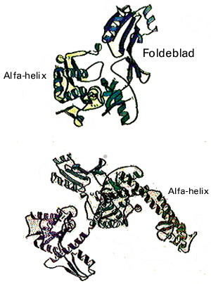 Proteinets sekundærstrukturAminosyrekæden er i visse afsnit rullet op i spiraler (alfa-helix) og i andre afsnit foldet i parellelle bånd (beta-blad). Aminosyrerækkefølgen er bestemmende for hvornår den ene struktur afløser den anden og for hvor store dele af molekylet, der er repræsenteret af den ene eller den anden struktur.Figur fra : Biology 4 - Lecture outline; http://academic.brooklyn.cuny.edu/biology/bio4fv/page/lect_o.htm (James Nishiura) | |