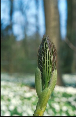 Træernes knopper bryder. De sammenfoldede løvblade, endnu beskyttede af knopskæl og med bladribberne udadvendt folder sig ud.