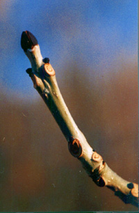 Knopper. Vestereng SkovStor harpiksholdig knop af hestekastanie og lille knop af ask med de meget karakteristiske sorte knopskæl. Bladar ses tydeligt på begge grene. |